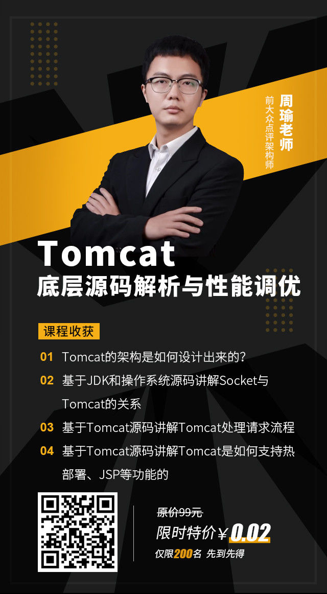 为了能让各位技术大牛们在最短的时间内系统全面的搞明白Tomcat, 鲁班学院联合腾讯课堂特地邀请到 前大众点评资深架构师 周瑜 老师 ,开设了 《 Tomcat底层源码分析与性能调优 》 。 原价99元 ,粉丝专属优惠,仅需 0.02元 。