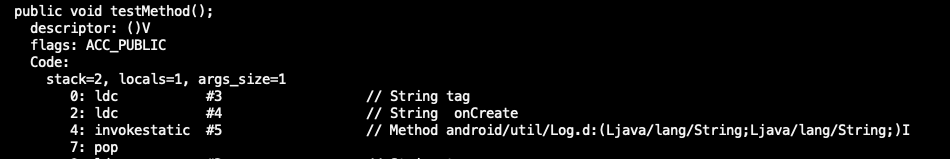 由于我们知道onCreate方法的返回值就是空,所以我们只需要捕获这个return指令就可以了。 这里的指令范围非常广,比如加减乘除、条件判断、aload等等,这些指令常量被封装到Opcodes类中。