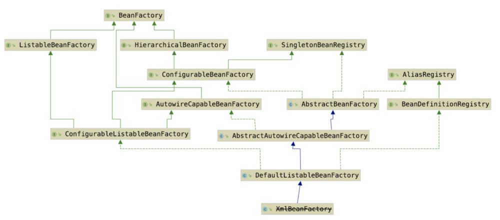看到这些错综复杂的类关系图,我们不禁感慨,spring的庞大。那么spring为啥要定义这么多接口呢?因为每个接口都有它使用的场合,各个接口之间具有一定的职责,但是又互不干扰,这就是设计模式中的接口隔离原则。你就想一下,如果把这些功能全都在一两个接口实现,那且不是乱成一团糟。