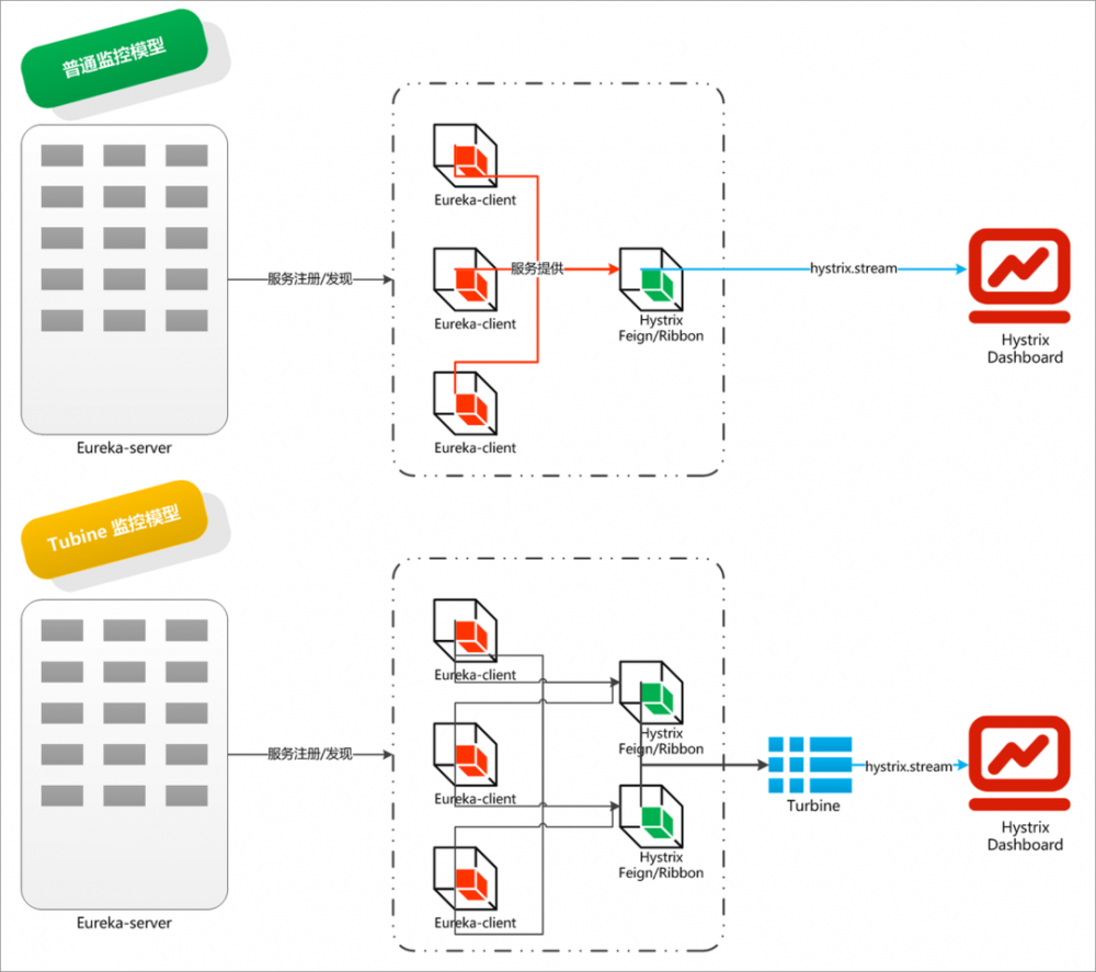 Hystrix Dashboard 可以定时收集接口调用信息;时长、次数、性能、熔断等各项指标来进行监控展示,但是我们每次监控都需要输入一个Hystrix 的链接例如: http://localhost:9001/actuator/hystrix.stream, 但是这样并不利于我们去做整体服务的监控,并且在实际使用的过程中如果是几十到几百个接口那么这样的监控几乎达不到监控效果,就累死在监控路上了。因此我们需要使用到 Turbine 来进行监控信息聚合,可以按业务组定义配置方便监控。