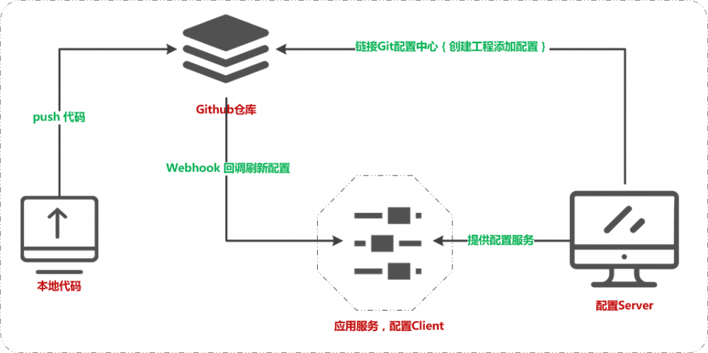 在实际开发中经常会有一个叫做配置中心的服务,这个服务经过变更参数来动态刷新线上业务数据行为配置。比如;行为开关、活动数据、黑白名单、本地/预发/线上环境切换等等,这些配置信息往往需要在我们不重启系统的时候就可以被更新执行。那么我们一般会使用具备此类属性在分布式系统中适合的组件进行开发配置中心,像是zookeeper、redis发布订阅、或者http定时轮许拉取,他们都可以做成统一配置中心服务。而在Spring Cloud Config 中,默认采用 Git 来存储配置信息,所以使用 Spring Cloud Config 构建的配置服务器,天然就支持对微服务应用配置信息的版本管理,在加上Github的Webhook钩子服务,可以在我们push等行为操作的时候,自动执行我们的http行为,以达到自动刷新配置服务。
