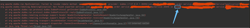 我隐藏连一些敏感信息,图中可以看到异常信息提示说:Not found exported service,我仔细查看后发现服务前段确实缺少scmp,这是公司在注册中心dubbo:registry中加入的group=scmp,难道和这个有关系么?默认是dubbo。