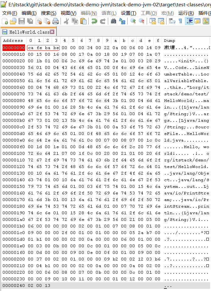 结果验证Notepad++ 打开HelloWorld.class,在'插件'工具中选HEX-Editor设置为View in Hex 默认为8-bit