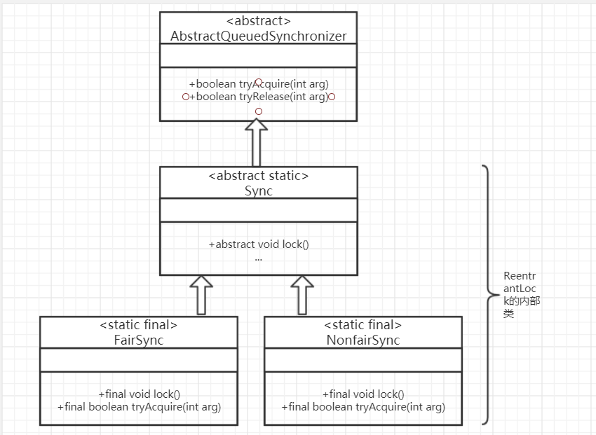 从下往上看,ReentrantLock类内部有两个静态内部类FairSync和NonfairSync,分别代表了公平锁和非公平锁(注意ReentrantLock实现的锁是可重入排它锁)。这两个静态内部类又共同继承了ReentrantLock的一个内部静态抽象类Sync,此抽象类继承AQS。
