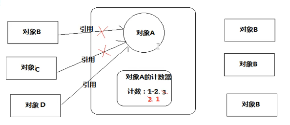 假设有一个对象A,任何一个对象对A的引用,那么对象A的引用计数器+1,当引用失败时,对象A的引用计数器就-1,如果对象A的计数器的值为0,就说明对象A没有引用了,可以被回收。