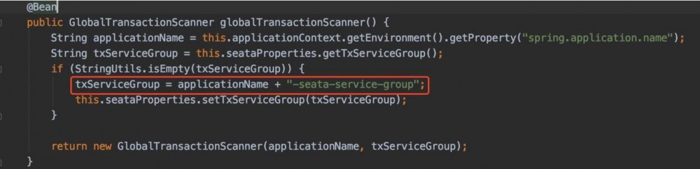 修改store.mode为db,修改对应db配置文件为你自己的mysql。 修改service.vgroup_mapping.my_test_tx_group=default属性 0.9.0.1版本后:my_test_tx_group修改为自己的服务名(spring.application.name)+"-seata-service-group" 0.9.0.1版本前:my_test_tx_group修改为自己的服务名(spring.application.name)+"-fescar-service-group" 可以spring-cloud-alibaba-seata项目下的GlobalTransactionAutoConfiguration累中看到