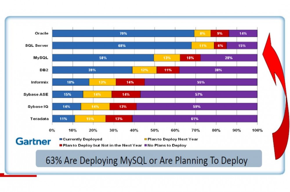 而 MySQL 在整个数据库图谱中占有非常重要的地位。 据全球著名分析公司 Gartner 提供的数据,已有超过 63% 的用户已经部署或者将要部署 MySQL。