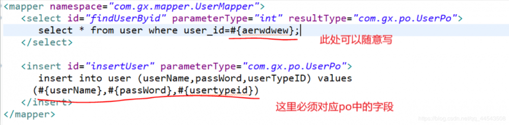 3、如果sql语句中只有 一个参数 ,此时参数名称可以 随意定义 如果sql语句有 多 个参数,此时参数名称应该是与当前表关联[实体类的属性名]或则[Map集合关键字], 不能随便写,必须对应 !如下图