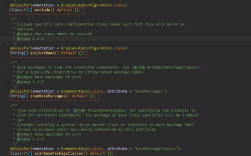 @ComponentScan(basePackages = {“com.example.dao”,“aaa”,“…”}) //多个