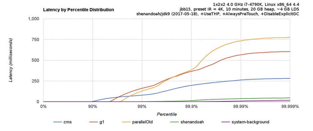 Shenandoah团队已针对SpecJBB基准发布了暂停时间延迟的基准评分,该基准将延迟与JDK 9时代的G1进行了比较。结果有很大提升。