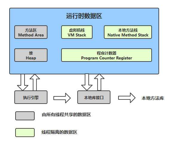 Java 虚拟机所管理的内存一共分为Method Area(方法区)、VM Stack(虚拟机栈)、Native Method Stack(本地方法栈)、Heap(堆)、Program Counter Register(程序计数器)五个区域。