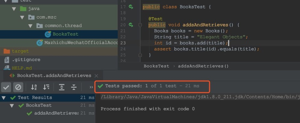 Books books = new Books(); String title = "Elegant Objects"; int id = books.add(title); assert books.title(id).equals(title);