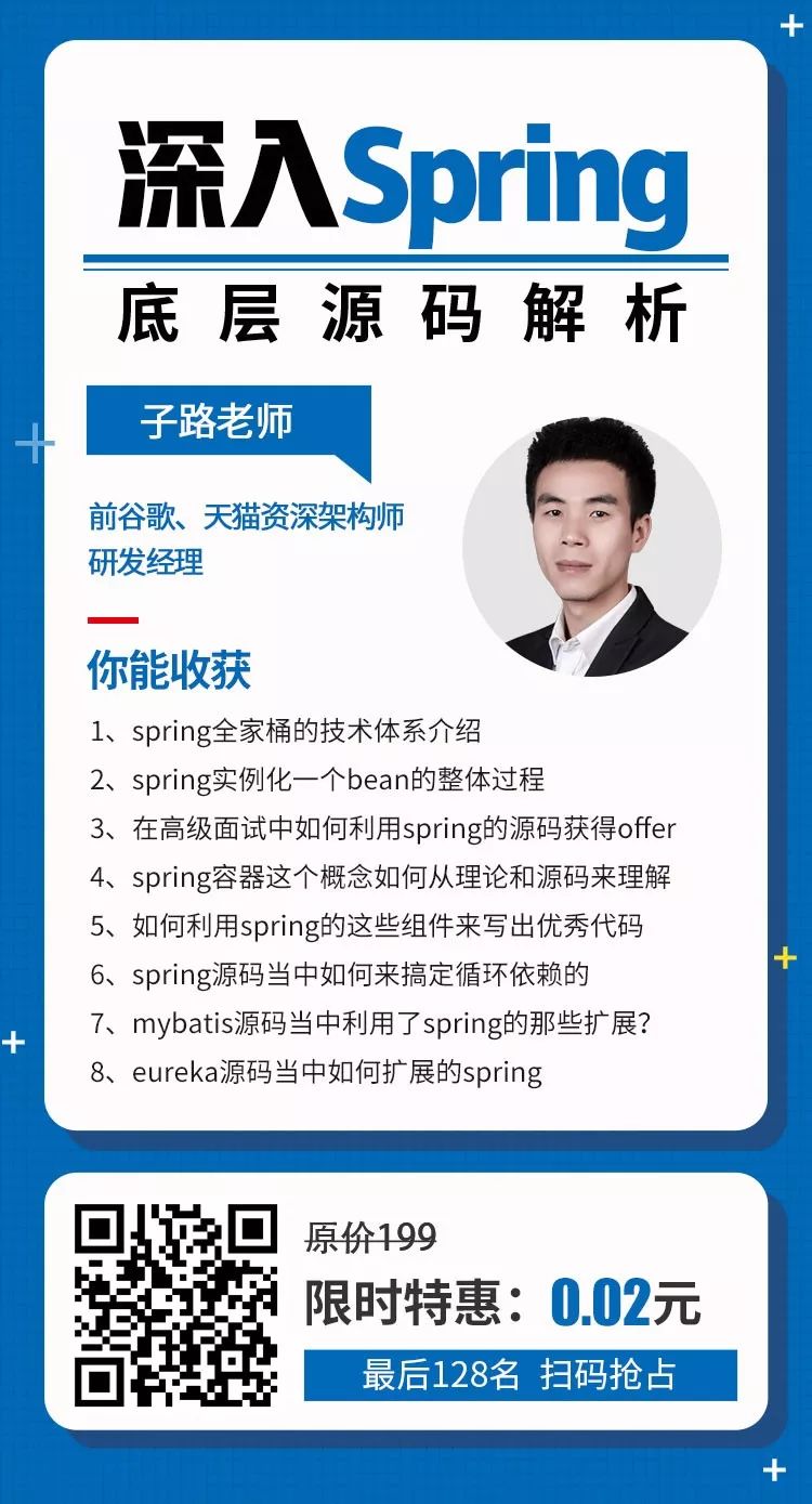 为了让各位未来的技术大牛们,能在最短的时间 系统全面的 学习Spring,我们特地邀请到前谷歌、天猫电商资深架构师 子路老师 ,为我们带来了这堂 《Spring底层源码解析》 专题课程。原价 99元 ,本号粉丝限时特惠 0.02元 。