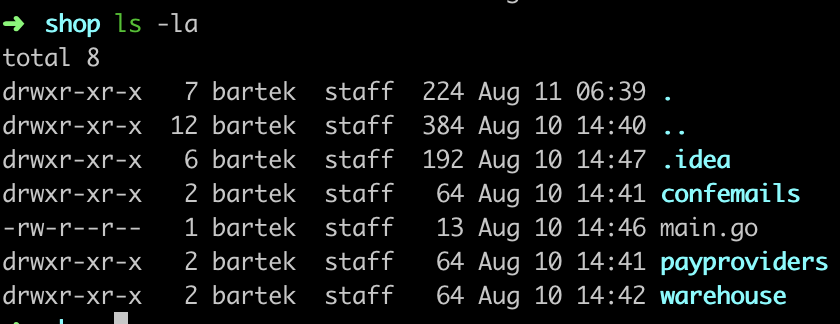 这只是我们有 3 个包的项目的一个例子: confemails , payproviders 和 warehouse 。包名应尽量简短并能让人一目了然。