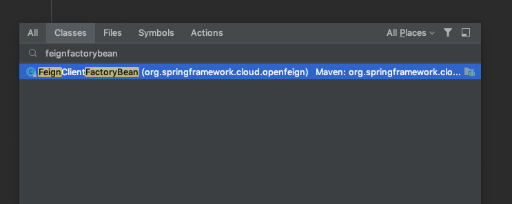 在Java里面,一般这种只需要配置接口和注解就可以直接使用的框架的本质基本上都是通过代理和反射来实现的,而在Spring里面,一般都会有对应的 FactoryBean ,在idea中连续按下两次 Command+N ,输入 FeignFactoryBean ,结果如下图所示: