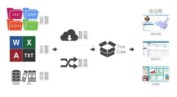 数据分析工作虽然隐藏在业务系统背后,但是具有非常重要的作用,数据分析的结果对决策、业务发展有着举足轻重的作用。随着大数据技术的发展,数据挖掘、数据探索等专有名词曝光度越来越高,但是在类似于Hadoop系列的大数据分析系统大行其道之前,数据分析工作已经经历了长足的发展,尤其是以BI系统为主的数据分析,已经有了非常成熟和稳定的技术方案和生态系统,对于BI系统来说,大概的架构图如下: