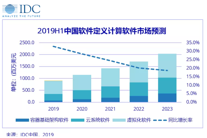 据IDC最新发布的《软件定义计算软件市场半年跟踪报告》显示,2019年上半年中国软件定义计算软件市场的市场规模达到了3.4亿美元,同比增长36.3%。IDC预测,该市场在数据中心现代化、企业基础架构云化以及云原生应用普及化的趋势下,在未来五年其复合增长率仍将达到24.8%,到2023年市场规模将达到20.3亿美元。