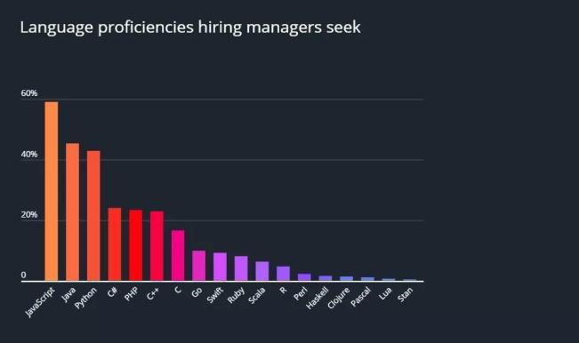 公司到底需要会哪些编程语言的程序员呢?根据调查结果显示,企业需求量最大的三种编程语言分别是 JavaScript、Java 和 Python。另外,C#、PHP 和 C++ 的占比也超过了 20%。