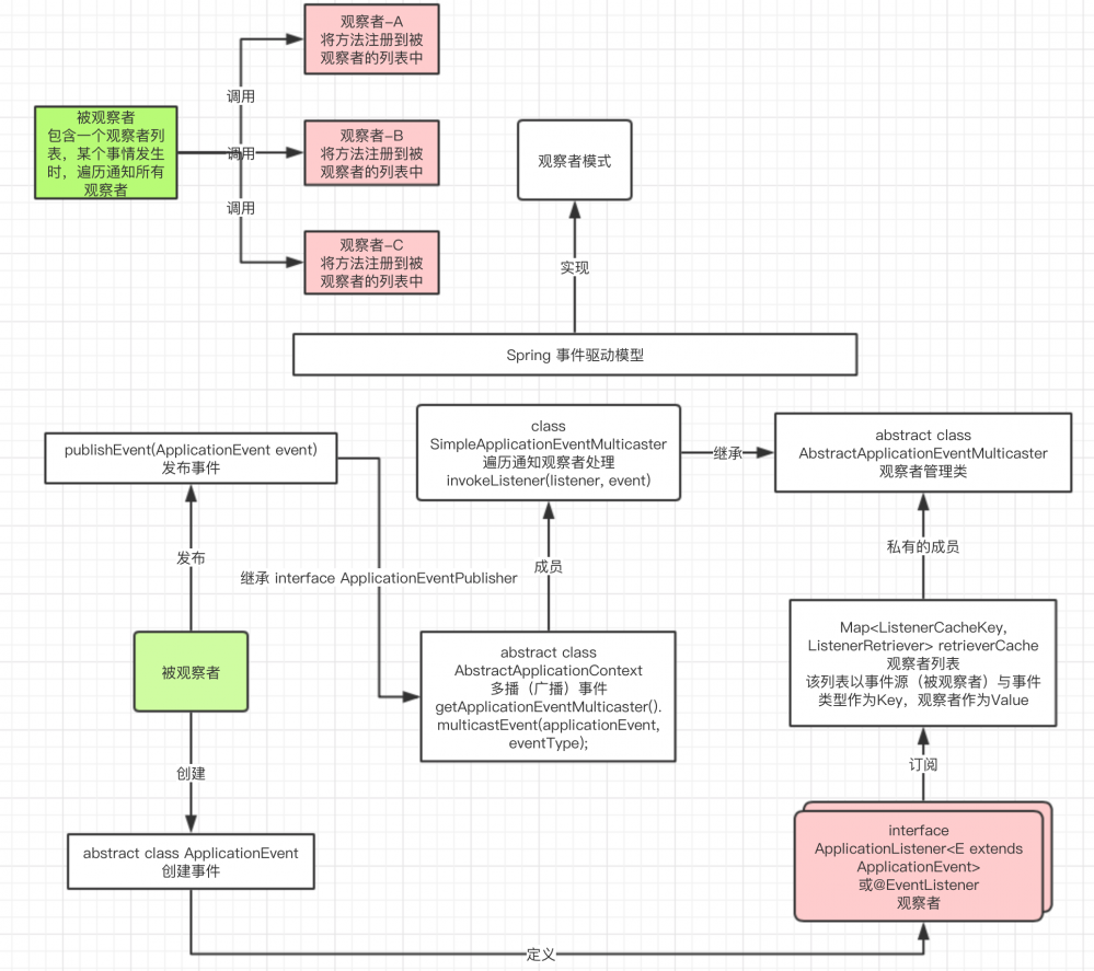 上面图中是Spring事件驱动模型的实现示意图,以下再补充一些图中未提现的实现细节:抽象类abstract class AbstractApplicationEventMulticaster中根据事件和事件类型获取对应的观察者的方法是: