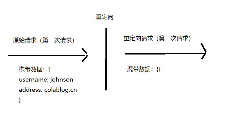 那么问题来了:请求中的数据生命周期存活时间只在一个请求转发(request)中,当这个请求结束后,那么请求中所带的数据也会随着这个请求一起拜拜了。而重定向会向服务器发起两个请求,所以第一个请求的数据不就到不了第二个请求了吗?如图: