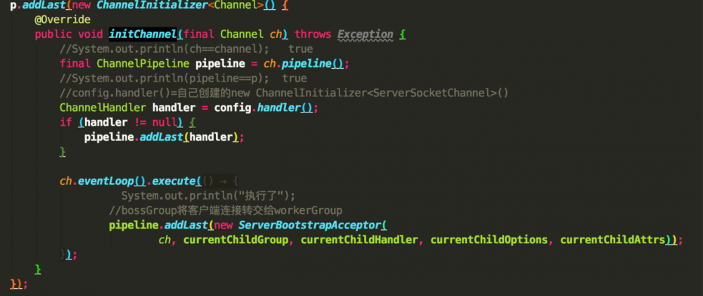 在 initAndRegister() 方法中,会调用 init(channel) 方法,在init(channel)方法中通过pipeline.addLast()向pipeline中添加了一个ChannelInitializer类型的匿名类,在本文的 ”上篇回顾“ 这一部分中就提到说这一步非常重要,现在就来说下它究竟有多重要了。