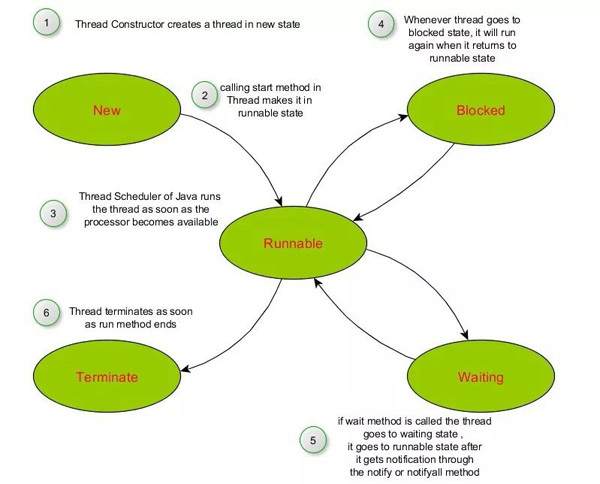 4. Waiting:线程可以调用wait()进入waiting状态。当其他线程调用notify()时,它将回到runnable状态。
