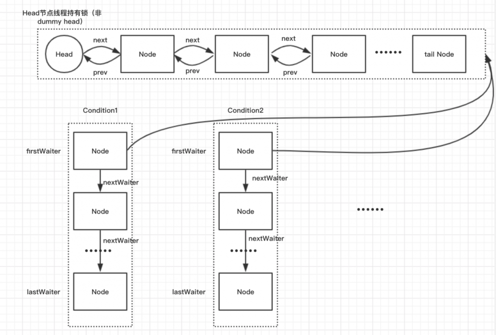 整个Condition整体的队列模型如上,包含一个同步队列和多个条件队列,如果线程执行时条件不满足,调用await()方法,会将该线程封装成Node节点添加到condition的条件队列中,一旦满足条件,条件队列便会被其他线程signal()通知头节点 并请到同步队列去抢锁,抢到锁后便会从wait()方法退出,继续执行。每个condition实例都对应一个条件队列,条件队列的实现类是 ConditionObject ,内部维护了一个单向链表,每个节点也都是一个Node实例,毕竟因为将来是要被从条件队列转移到阻塞队列中的。