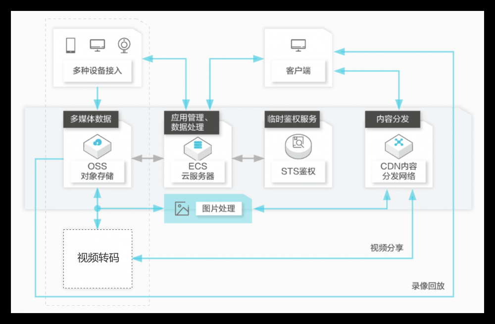 这是一个非常典型的解决方案, 对象存储 OSS 可以支持海量视频存储,采集上传的视频被转码以适配各种终端,CDN 加速终端设备播放视频的速度。此外还有一些 内容安全 审查需求, 比如鉴黄、鉴恐等。