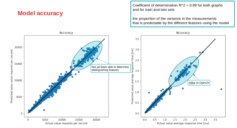 在下面的图中,我显示了预测值与实际值的对比。对角线表示完美的精度。如您所见,该模型的准确性很高。同样,响应时间和吞吐量的R ^ 2值(确定系数)都约为0.99,这非常好!