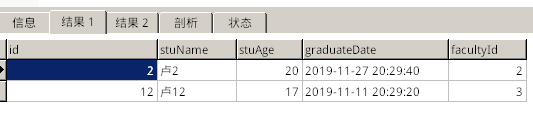 当前页面记录数:4 符合条件记录数:9 当前页数:2 总页数:2 Result(id=5, stuName=卢5, stuAge=17, graduateDate=Thu Nov 21 20:29:20 CST 2019, facultyName=计算机与通信工程学院) Result(id=11, stuName=卢11, stuAge=17, graduateDate=Thu Nov 21 20:29:20 CST 2019, facultyName=计算机与通信工程学院) Result(id=12, stuName=卢12, stuAge=17, graduateDate=Mon Nov 11 20:29:20 CST 2019, facultyName=文法学院) Result(id=13, stuName=卢13, stuAge=17, graduateDate=Wed Nov 20 20:29:20 CST 2019, facultyName=数学与统计学院)