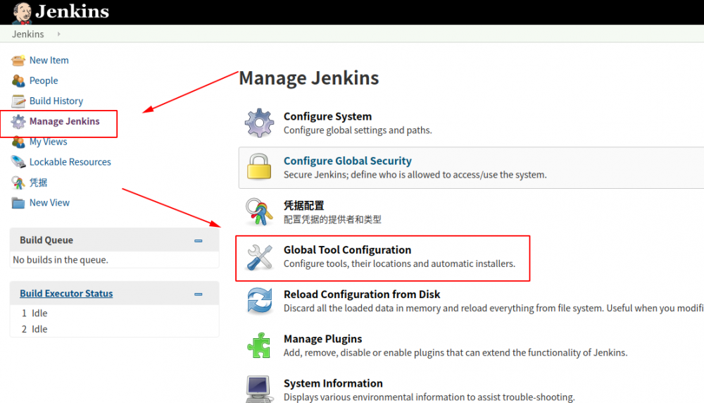 点击侧边栏的Manage Jenkins,然后点击Global Tool Configuration,进入全局工具设置