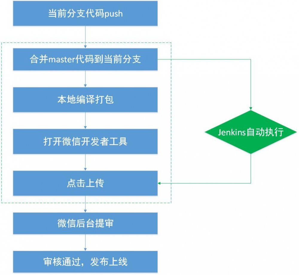 我们通过在jenkins上创建job来实现小程序的自动化构建。将上述提审过程的2,3,4,5,6实现自动化一键编译、部署、上传,解放人力。