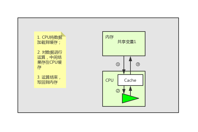 上面提到 CPU 进行运算时需要将共享变量先加载到CPU缓存中,运算结束后再将最新数据写回共享内存。这种看起来完美的工作方式其实存在一个问题,下面我们就以上面的图片为列子,说下这个问题。