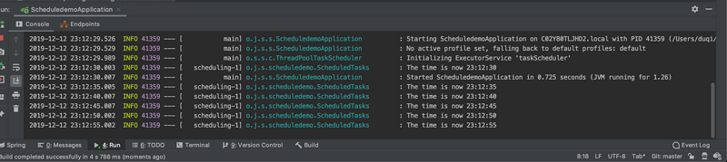 } 在ScheduledemoApplication中开启定时调度能力——即开启 @Scheduled 注解的定时调度功能,并在系统刚起来的时候打印一行日志,用来体现上一步中的initialDelay的作用。