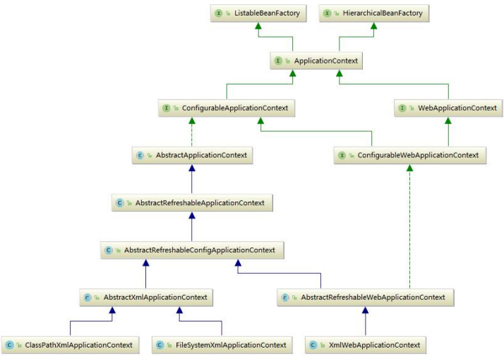 本文以ApplicationContext为例讲解,XmlWebApplicationContext、ClasspathXmlApplicationContext等都属于这个继承体系,这些都是我们日常开发中很熟悉的。其继承体系如下图: