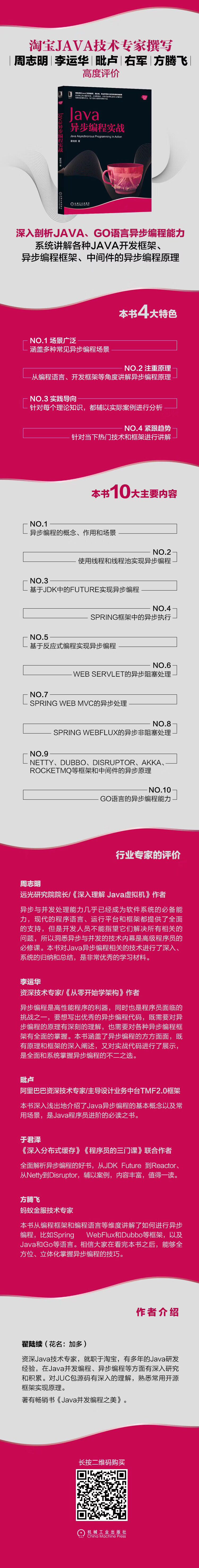 本书涵盖了Java中常见的异步编程场景,这包含单JVM内的异步编程、以及跨主机通过网络通讯的远程过程调用的异步调用与异步处理、以及Web请求的异步处理等等。