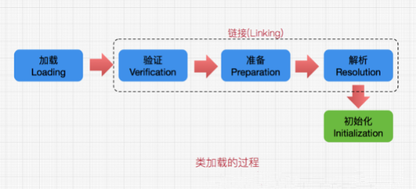 每个编写的”.java”拓展名类文件都存储着需要执行的程序逻辑,这些”.java”文件经过Java编译器编译成拓展名为”.class”的文件,”.class”文件中保存着Java代码经转换后的虚拟机指令,当需要使用某个类时,虚拟机将会加载它的”.class”文件,并创建对应的class对象,将class文件加载到虚拟机的内存,这个过程称为类加载,这里我们需要了解一下类加载的过程,如下: