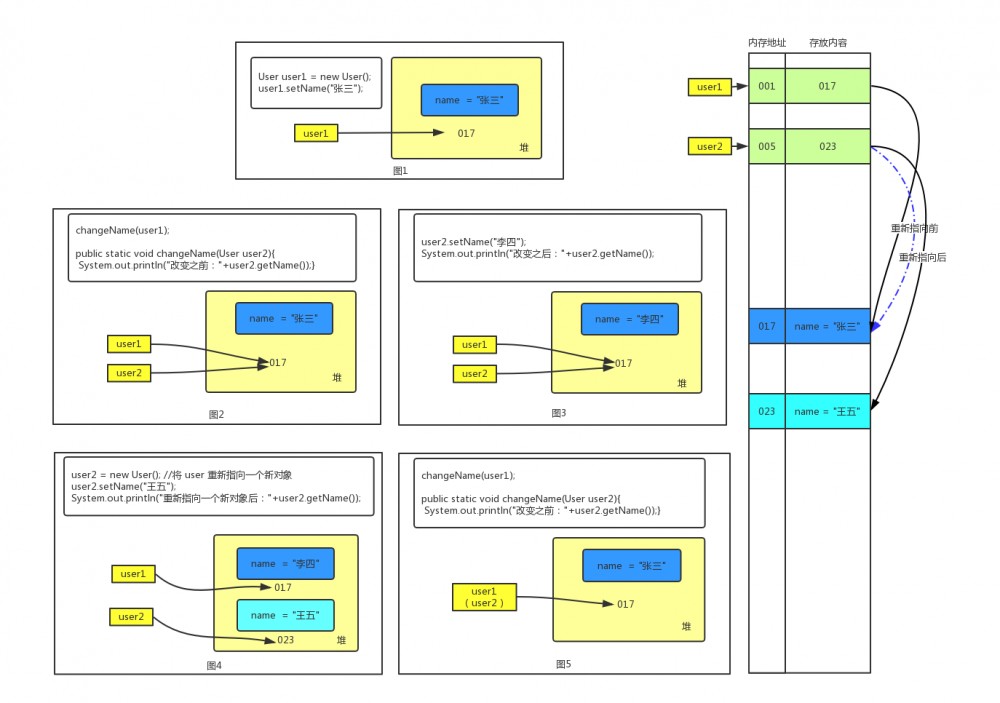 下面我们以上图为辅助,来分析这段程序,首先我们定义了一个 User 类,然后在测试类中实例化了一个 User 对象,名为 user1 ,并且为其赋值 name = '张三' ,此时在内存中如 图1 所示,实例化一个对象相当于在堆中开辟了一块内存,内存地址为 017 ,此时这个对象的引用为 user1 ,内存地址为 001 ,它保存了该对象在内存中的地址,也就是指向了该对象。接下了,我们调用方法 change() ,来尝试改变 user1 的 name 值以此验证 java 中的传值方式。