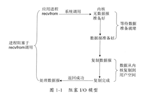 在进程空间中调用recvfrom,其系统调用直到数据包到达且被复制到应用进程的缓冲区中或者发生错误时才返回,在此期间会一直被阻塞