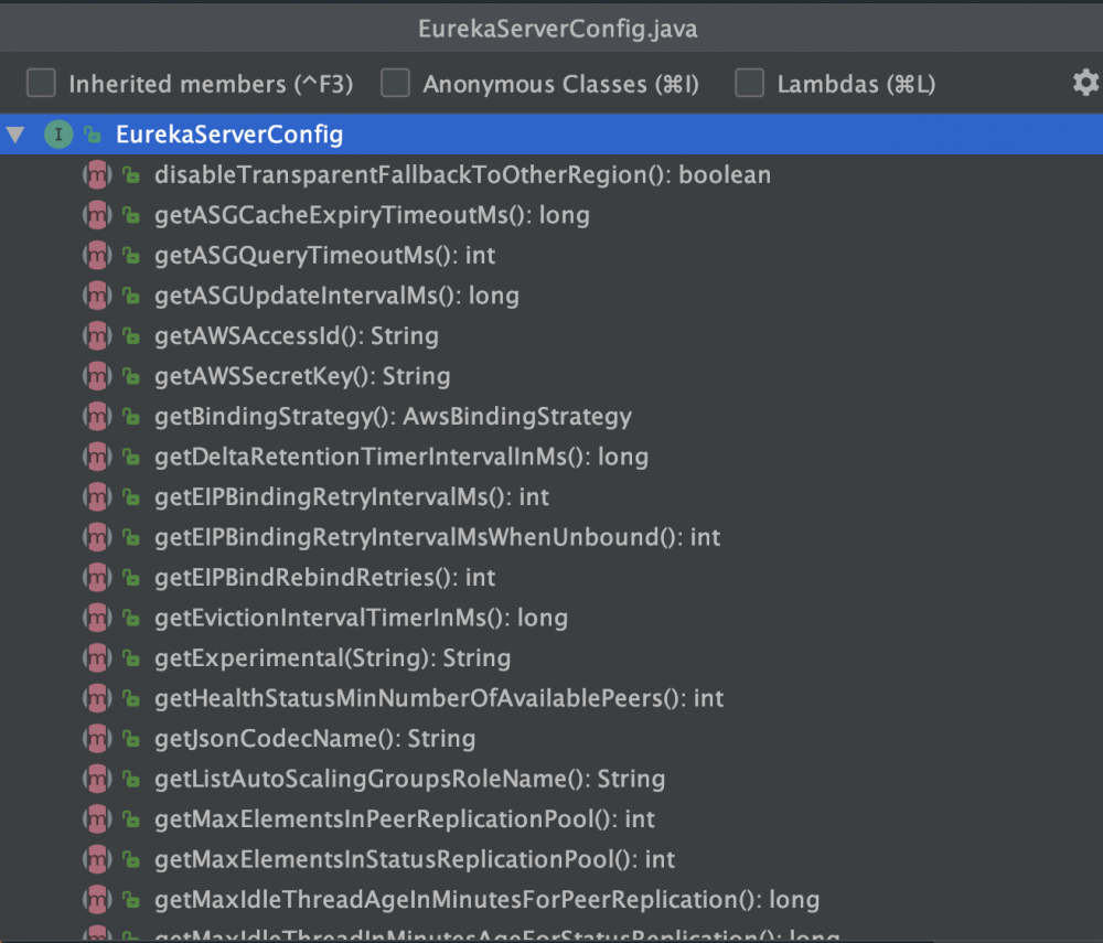 其中configInstance是 DynamicPropertyFactory 对象。EurekaServerConfig,这是个接口,这里面有一堆getXXX()的方法,包含了eureka server需要使用的所有的配置,都可以通过这个接口来获取。