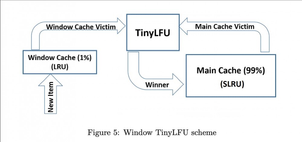 值得一提的是Window-TinyLRU算法,底层采用一个LRU的Window队列作为缓冲层,以及一个SLRU(Segmented LRU)队列作为Main Cache,同时对于MainCache中的缓存,使用O(1)时间复杂度的CountMin Sketch算法进行频率统计,整体的算法示意图如下: