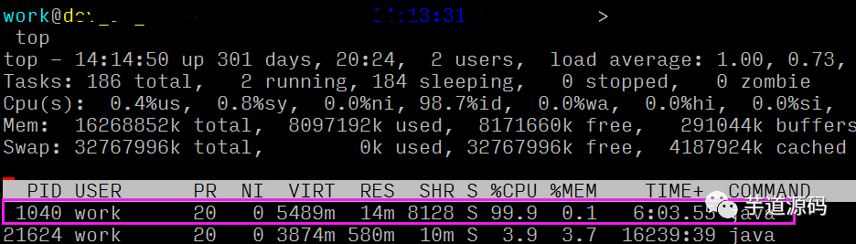 编译、运行上述代码之后,咱们就能观察到服务器多了一个 100% CPU 的 java 进程: