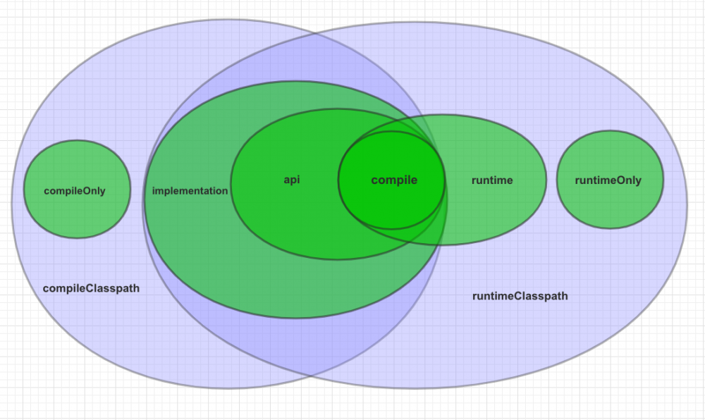 JavaLibrary 会生成主要的几个 Configuration: api , compile , compileOnly , compileClasspath (JAVA_API) , implementation , runtime , runtimeOnly , runtimeClasspath (JAVA_RUNTIME) , apiElements (JAVA_API) , runtimeElements (JAVA_RUNTIME_JARS) .