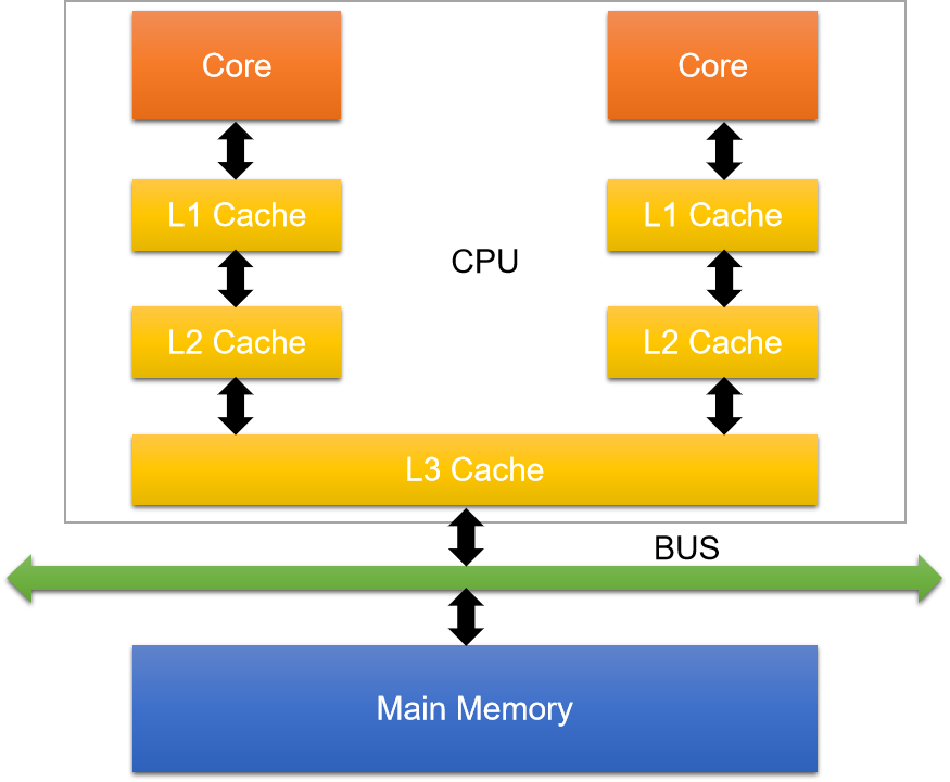CPU的流行架构如上图所示,当CPU要load一个数据时,首先从一级缓存中查找,如果没有找到再从二级缓存中查找,如果还是没有就从三级缓存或内存中查找。
