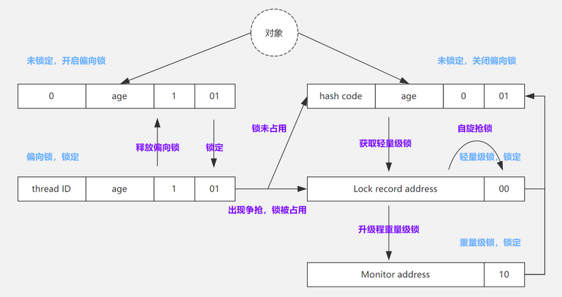java1.6以后,为了减少获取锁和释放锁的性能消耗,引入了“偏向锁”和”轻量级锁“。锁的状态可以从无锁状态->偏向锁->轻量级锁->重量级锁,随着竞争情况逐渐升级,但是不能降级。