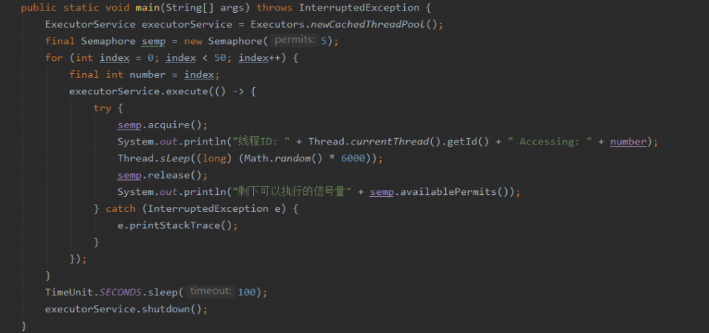 Semaphore(信号量)它通过 new Semaphore(permits) 来进行创建,permits 表示同一时间可以执行多少个线程。