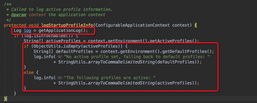 是在 org.springframework.boot.SpringApplication#logStartupProfileInfo 方法中打印的,日志级别为 INFO。