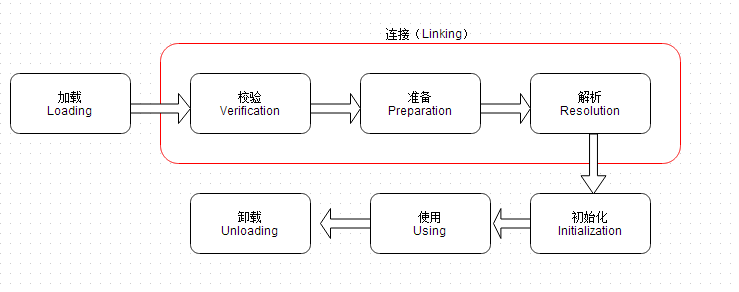 当 Java 虚拟机将 Java 源码编译为字节码之后,虚拟机便可以将字节码读取进内存,从而进行解析、运行等整个过程,这个过程我们叫:Java 虚拟机的类加载机制。JVM 虚拟机执行 class 字节码的过程可以分为七个阶段: 加载、验证、准备、解析、初始化、使用、卸载 。 其中加载、检验、准备、初始化和卸载这个五个阶段的顺序是固定的,而解析则未必。为了支持动态绑定,解析这个过程可以发生在初始化阶段之后。