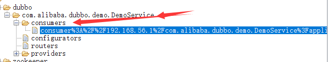 消费者在启动时,首先也会向注册中心注册自己,具体在${interface interface}/consumers目录下创建一个节点。