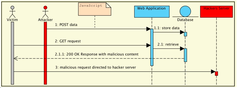xss攻击方式:一、反射性攻击,脚本代码作为url参数提交给服务器,服务器解析执行后,将脚本代码返回给浏览器,最后浏览器解析执行攻击代码;二、存储性攻击,和发射性攻击的区别是,脚本代码存储在服务器,下次在请求时,不用再提交脚本代码。其中一个示例图如下所示: